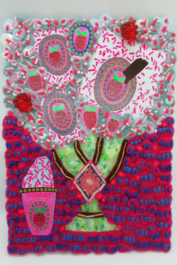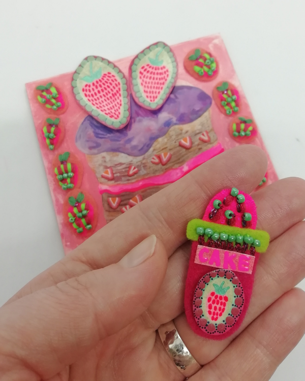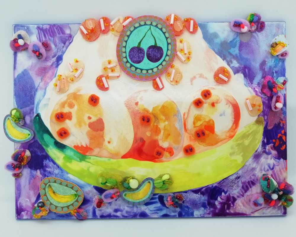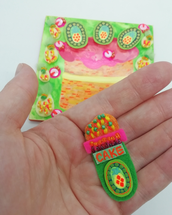 Each piece is a meticulously crafted world, bursting with colour and texture. Using gouache paints, inks, and a sprinkle of magic (okay, maybe sequins and beads!), I've brought these miniature desserts to life on little panels. Each piece also boasts hand-stitched details, adding a touch of whimsical charm – a testament to the time and love poured into each piece (the smaller ones take around 7 hours from conception to completion, with the larger ones taking even longer).