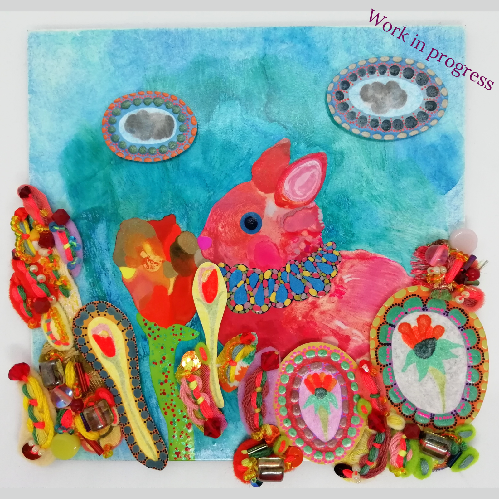 This will be the 3rd pink rabbit painting that I've made, the previous two were both called 'Bonnie', and each of them sat in a garden with exotic (made up imaginative) plants underneath a starry sky and shared the same poem. This cute little bunny will have to endure sparkly raindrops though - those tropical-looking plants sure need to be well watered, so the poem for the other two pieces won't quite work for this one. I've been noodling around with some ideas for the poem whilst I've been creating it. The foreground still needs to be filled up with more hand-embroidered flowers, and the sky will have some fluffy clouds made of wool and shiny things. I think he suits his blue ruffle collar immensely!